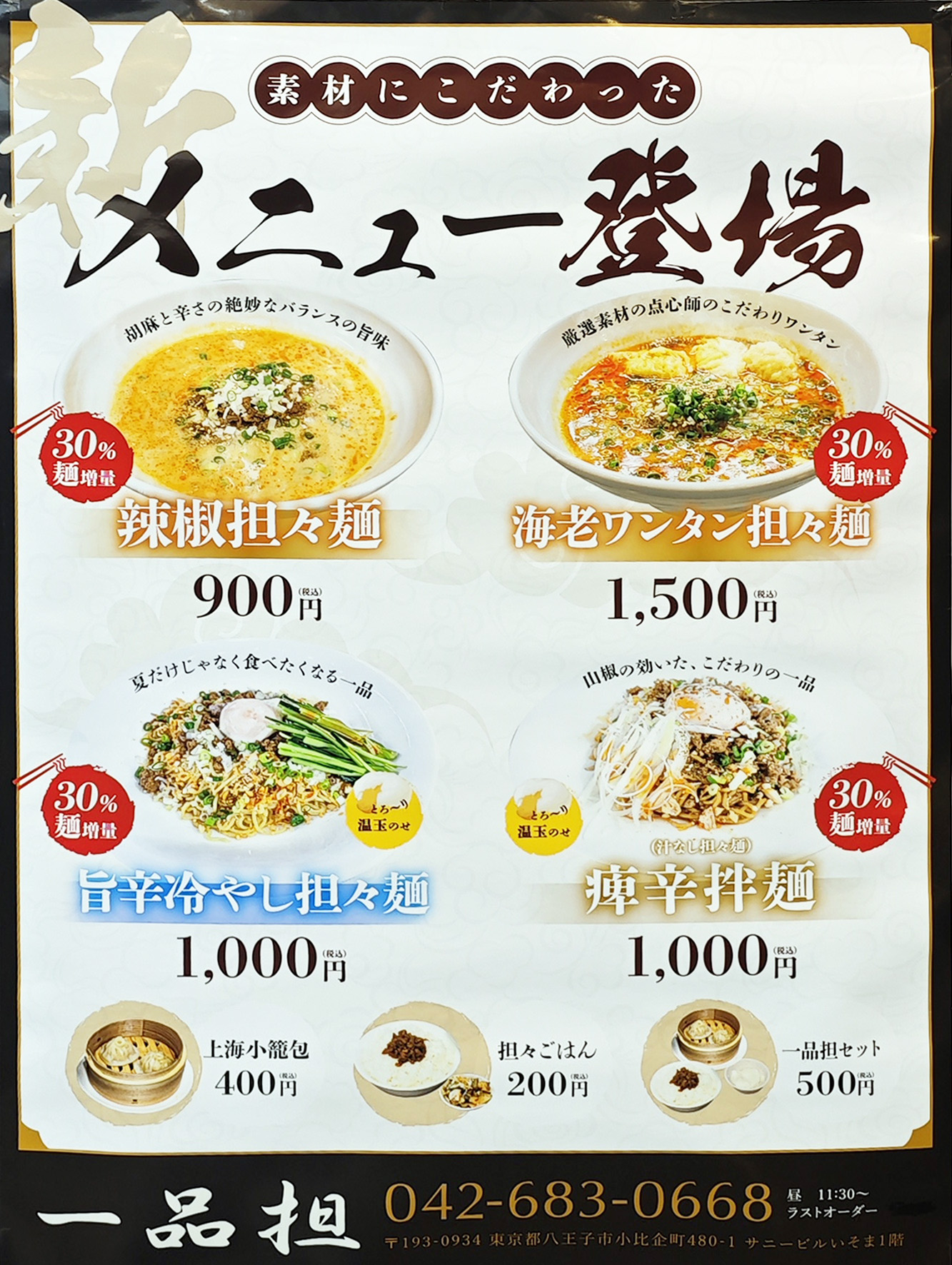 メニューは各種担々麺で、ただいま30%麺増量中!