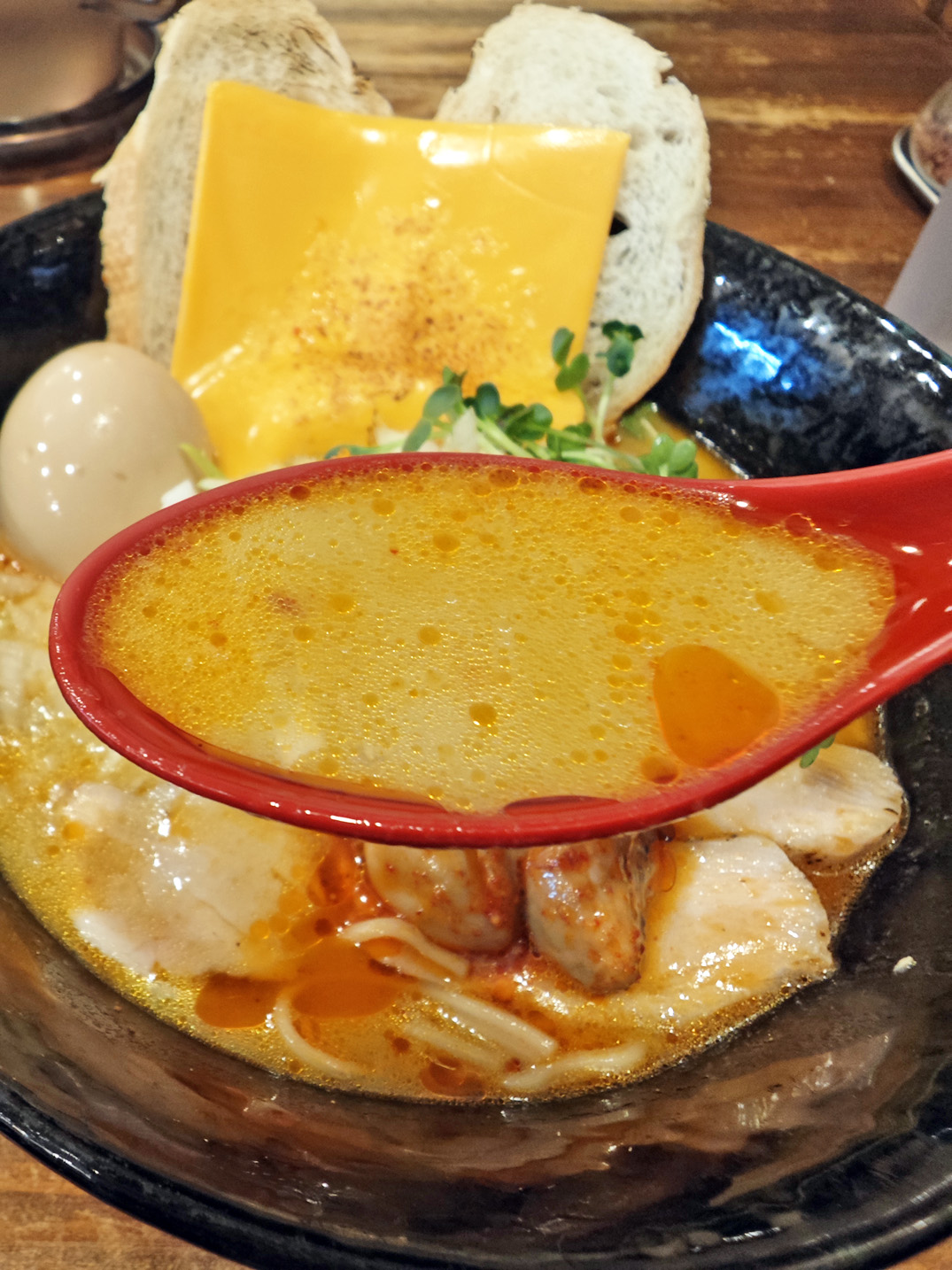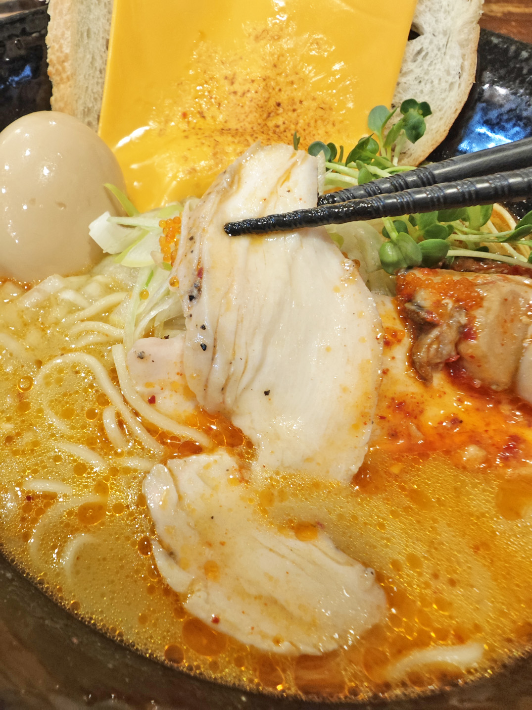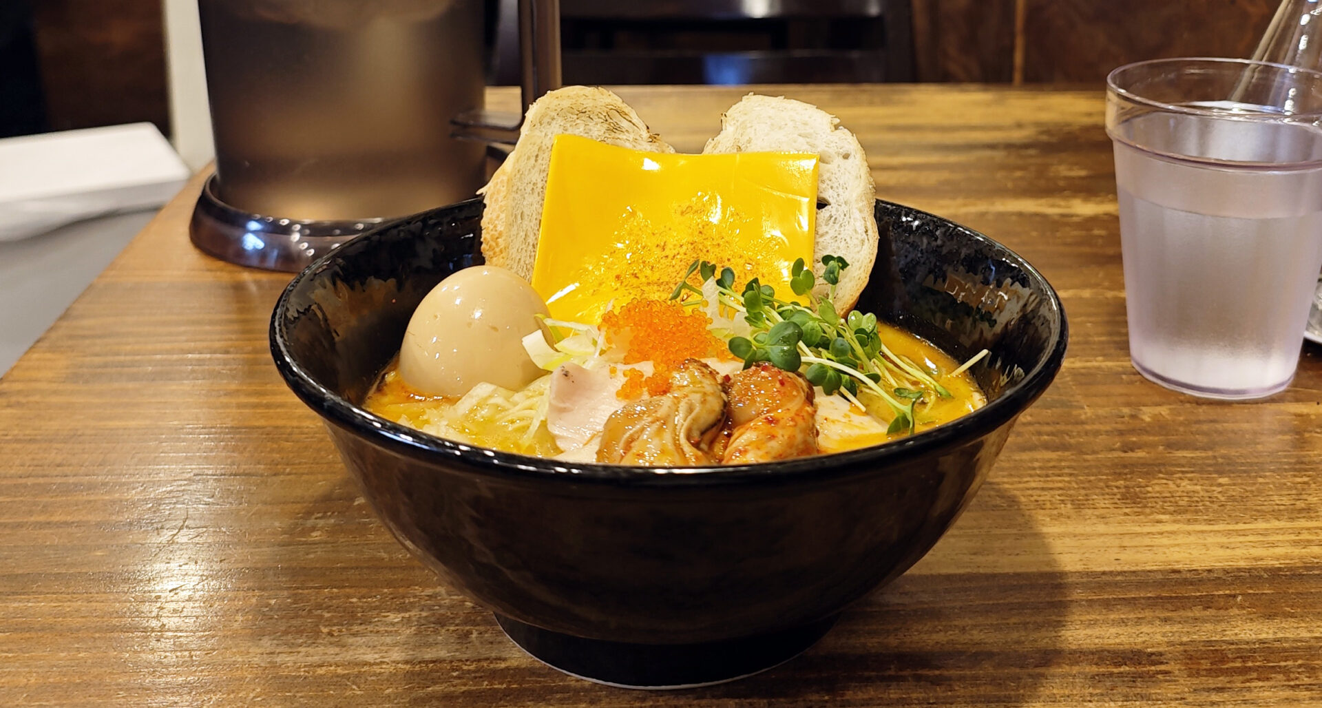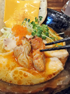しっとりとした鶏チャーシュー、濃厚な牡蠣のコンフィ、パケットにとろけるチーズ、爽やかなカイワレの辛味、とびっこのプチプチとした食感。