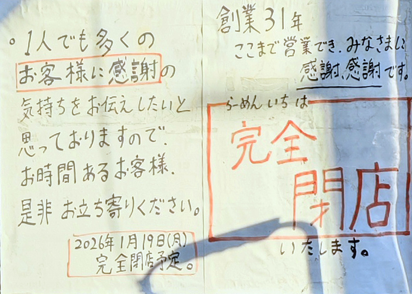 1月19日で”完全閉店”の告知があった八王子駅南口にある「らーめん いち」。