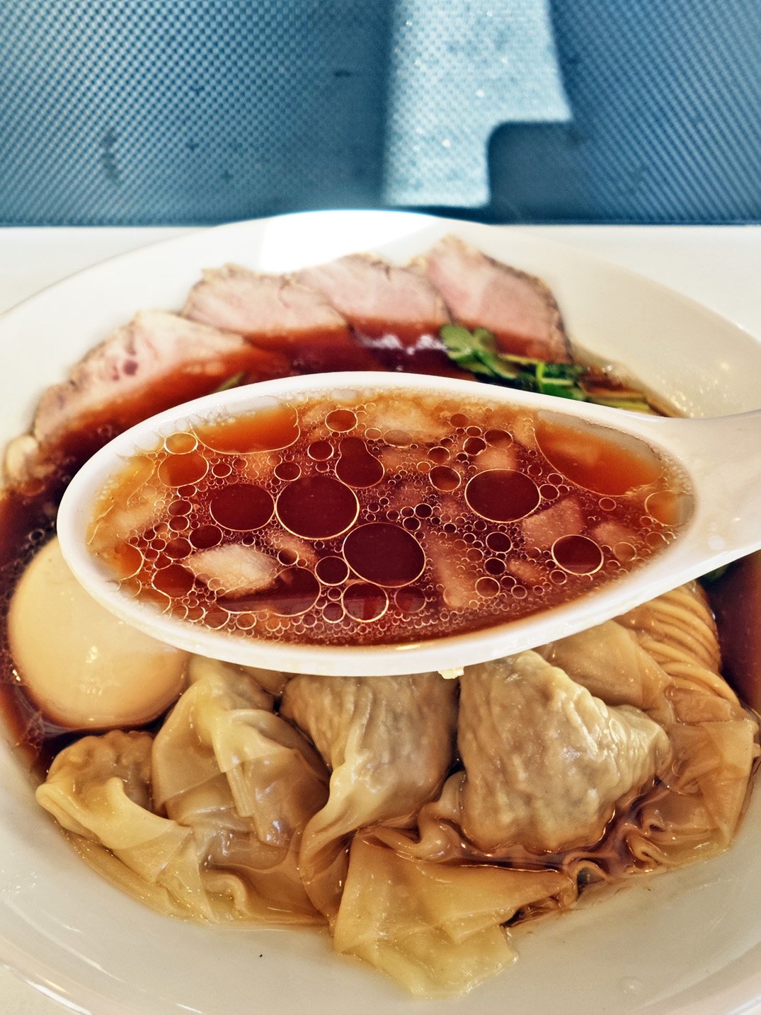 チャーシュー4枚、ワンタン4個、味玉、水菜、刻み玉ネギ。