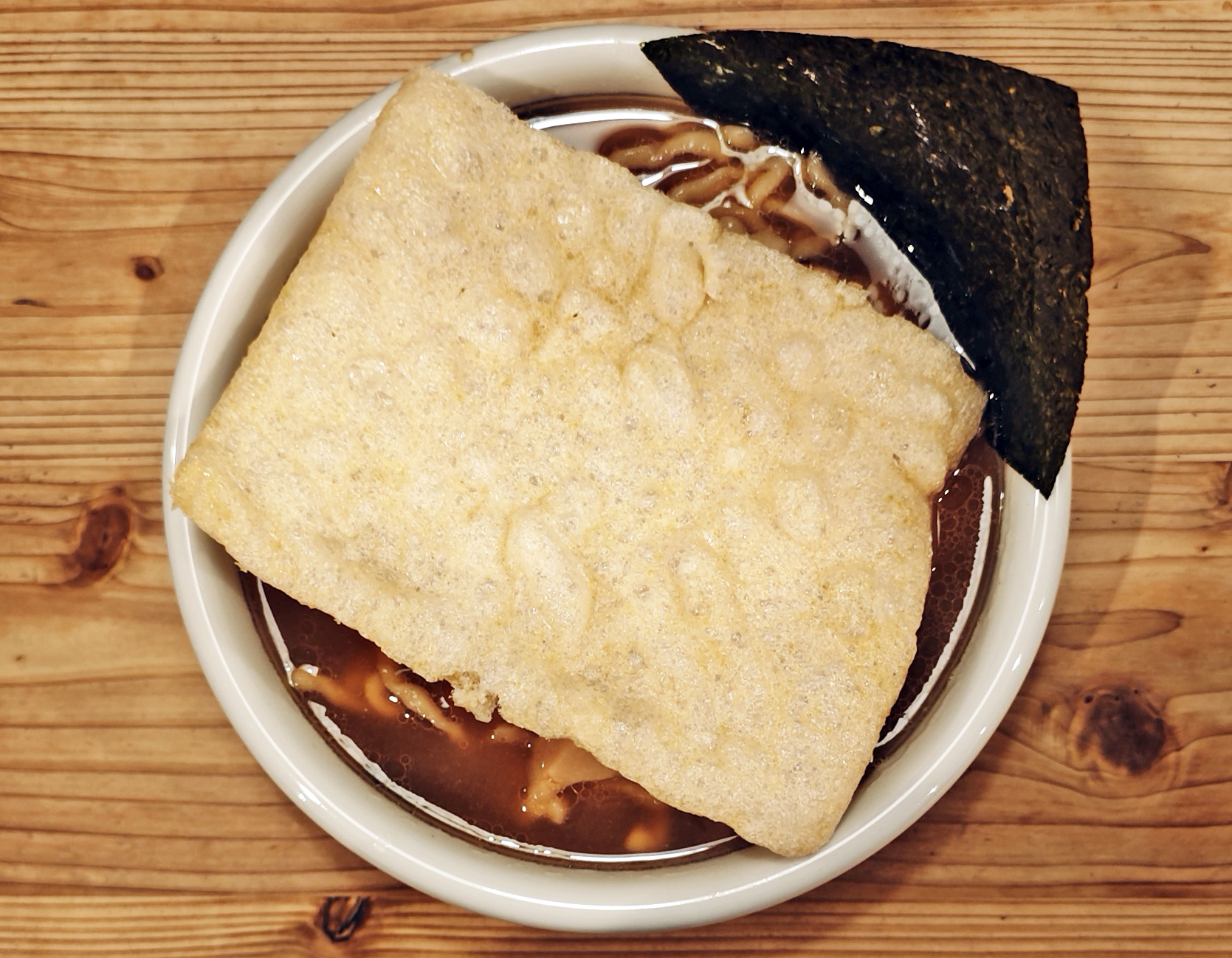「鯛醤油きつねらーめん」は、丼を覆うようにして、油揚げが乗っています。