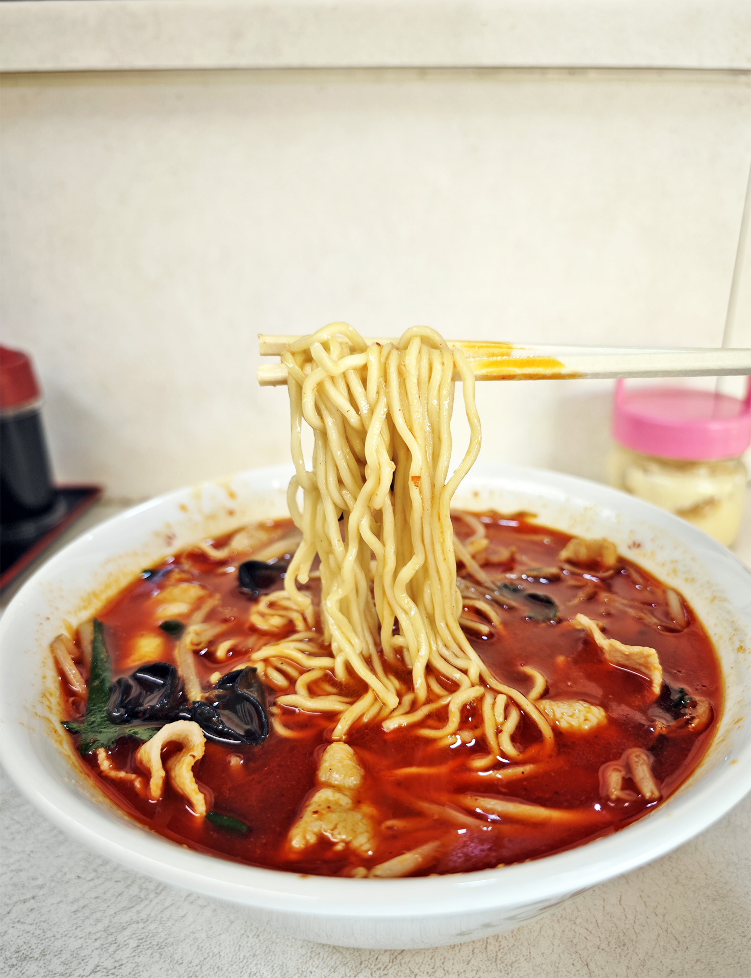 辣油がスープと溶け合い、麺にしっかり絡みつくことで、啜るたびに刺激と満足感が広がります。