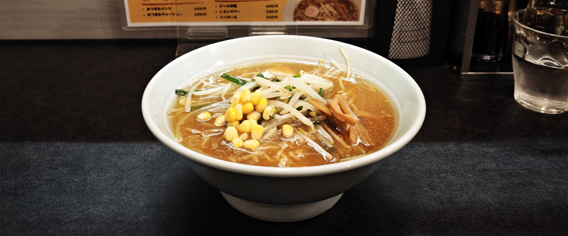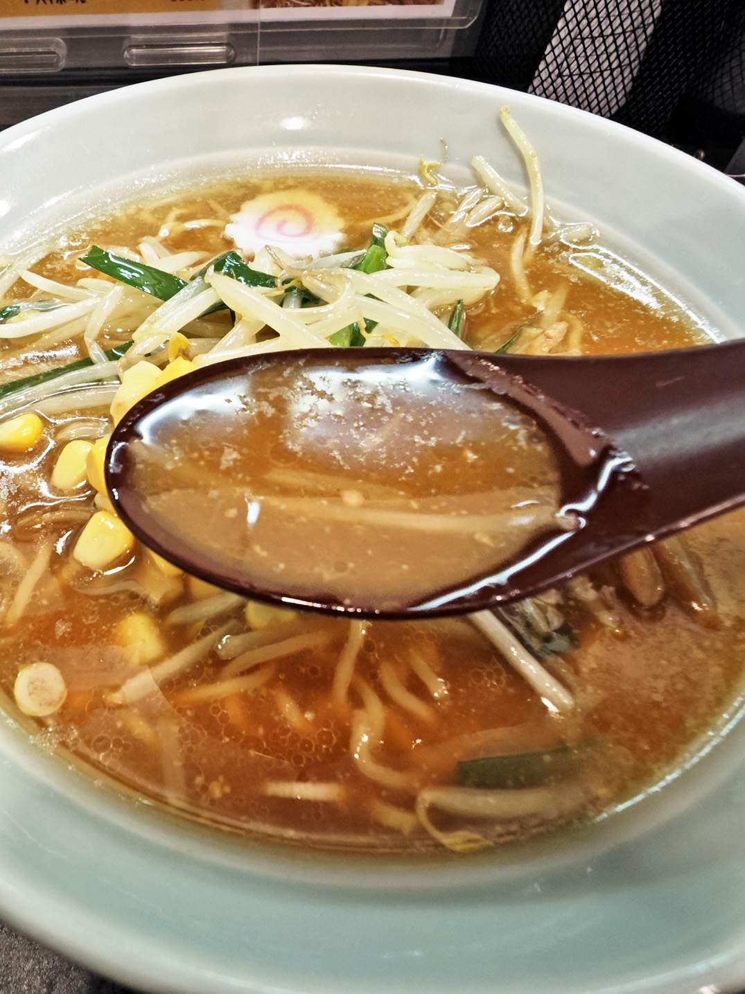 歯ごたえのよいメンマ、シャキシャキのもやし、ほろ苦さのあるニラ、甘みを添えるコーン、そして、ナルト。