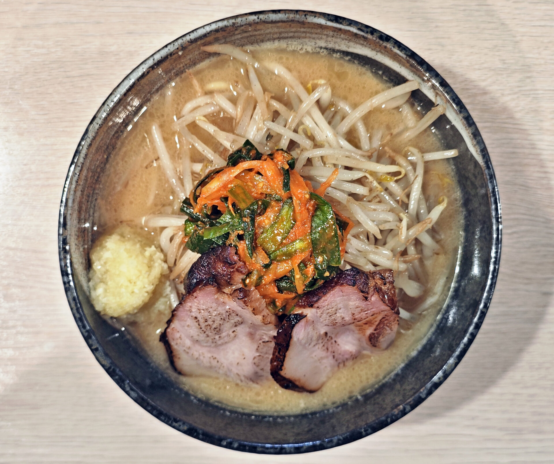 丼の上には、香ばしく炒められたもやし、表面をさっと炙ったチャーシューが2枚、そしてトッピングで加えた”ニラネギきむち”と”生ニンニク生姜”。