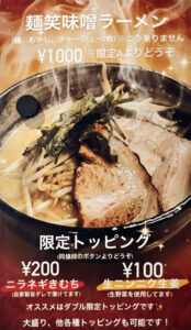 掲示されているPOPをみると、限定トッピングとして「ニラネギきむち」と「生ニンニク生姜」が用意されています。