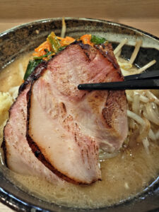 炙りチャーシューは、表面の香ばしさと対照的に、噛めばみずみずしい肉汁が広がり、肉本来の旨みをしっかり感じさせてくれます。