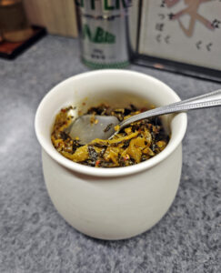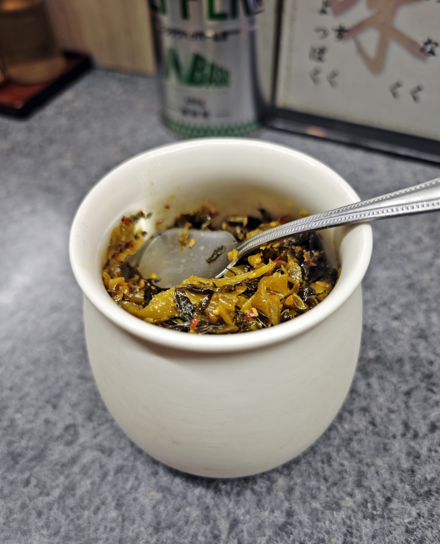 コリコリとした食感と塩気、そしてほどよい辛みがアクセントとなり、やや薄味だったスープに輪郭が生まれます。