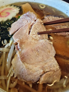 チャーシューは、2枚入っており、肉の繊維はきめ細やかで、噛むと口の中で優しくほどけます。