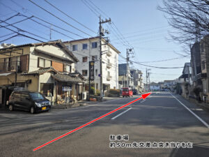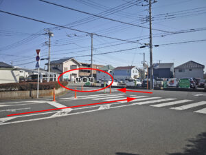 目の前の通りを写真の矢印の方向へ、突き当りの交差点まで進み、左に曲がったところにあります。