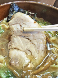 腕肉を使用した煮豚のチャーシューは、箸で持ち上げただけで、その柔らかさと肉質の良さが伝わります。
