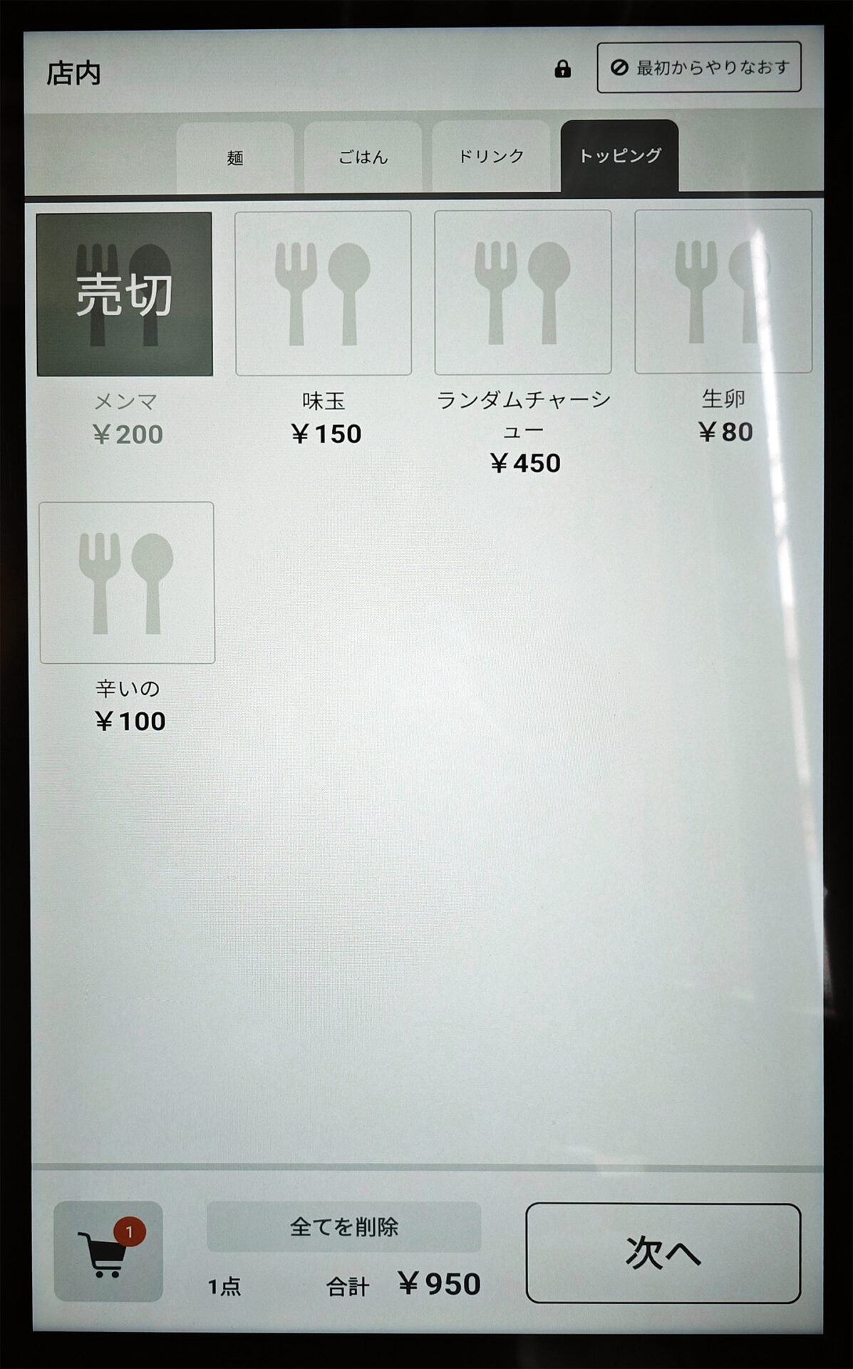 店内入って、右側に券売機があります。先にも書いた通り現金不可で、電子決済のみ対応です。