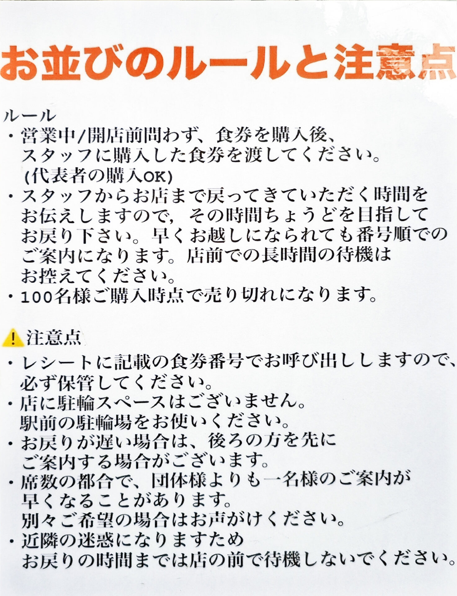 備考:「中華蕎麦 ひら井」出身。電子決済のみ(現金不可)。”《お並びのルールと注意点》・営業中開店前問わず、食券購入後、スタッフに購入した食券をお渡しください。(代表者購入OK)・スタッフからお店まで戻っていただく時間をお伝えしますので、その時間ちょうどを目指してお戻りください。・レシート記載の番号でお呼び出ししますので、必ず保管してください。”