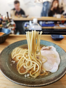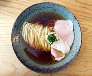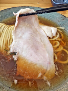 繊細なスープとは一見ミスマッチに思えるほどの太麺で、やや固めに仕上げられています。
