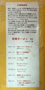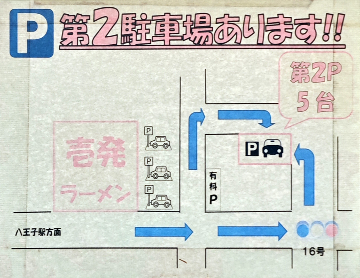 備考:2009年の12月18日に本店が台町(富士森公園前)から、八王子市万町19-1へ移転。ボリュームのあるラーメンと店員さんの元気のよい接客とパフォーマンスが売り。