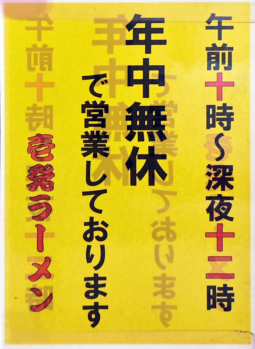 営業時間は、午前10時~夜の12時まで、通し営業です。しかも、年中無休。