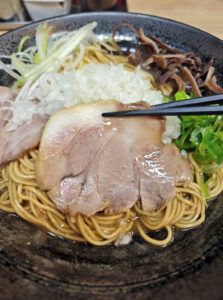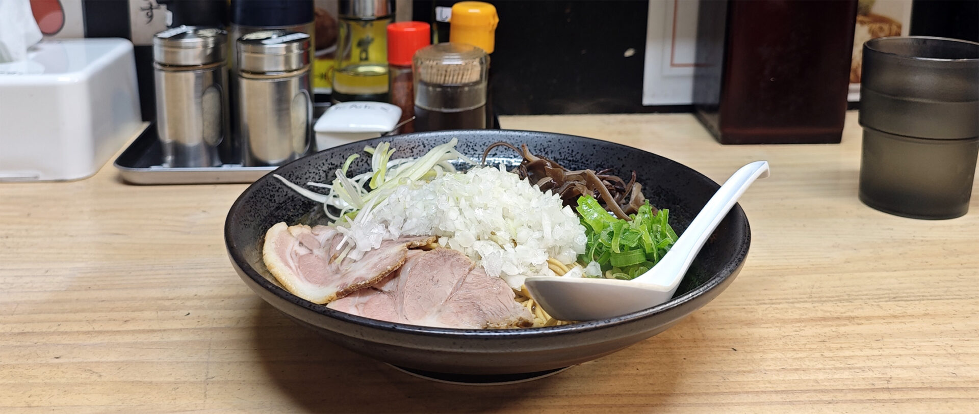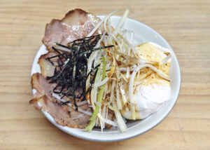 「八王子皿豚骨」は、豚骨醤油のコク深いタレにラードのまろやかな旨味が重なり、そこへ八王子ラーメンらしい刻み玉ネギのシャキッとした食感とほのかな辛味が絶妙なアクセントを添えています。