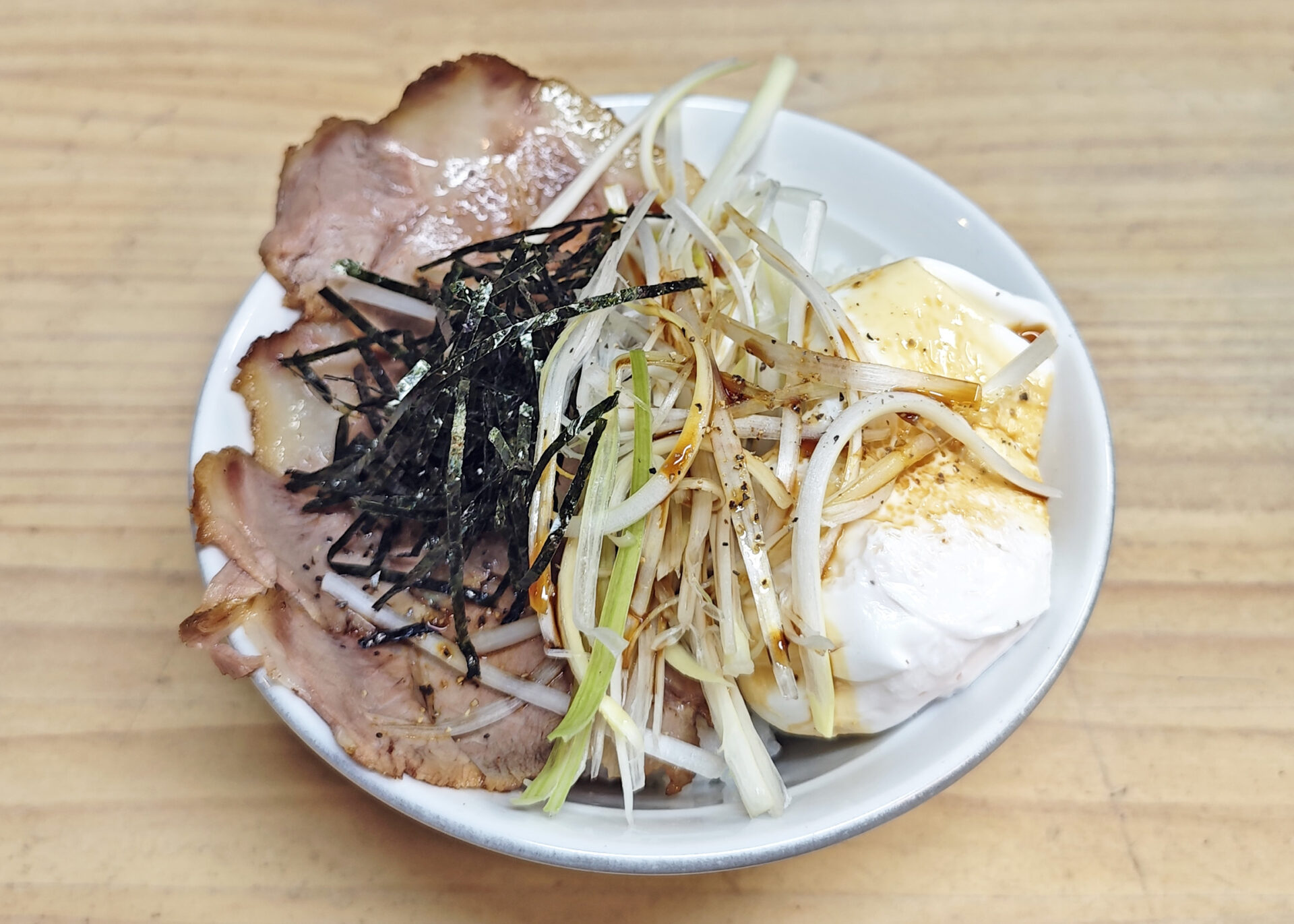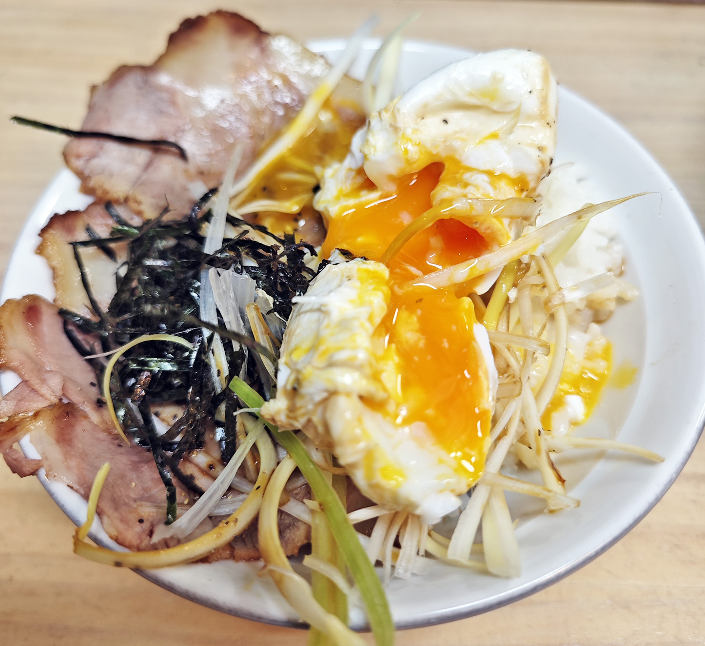 ご飯の上に並ぶチャーシューと白髪ねぎ、刻み海苔の上に鎮座するポーチドエッグは、それだけで食欲をそそります。