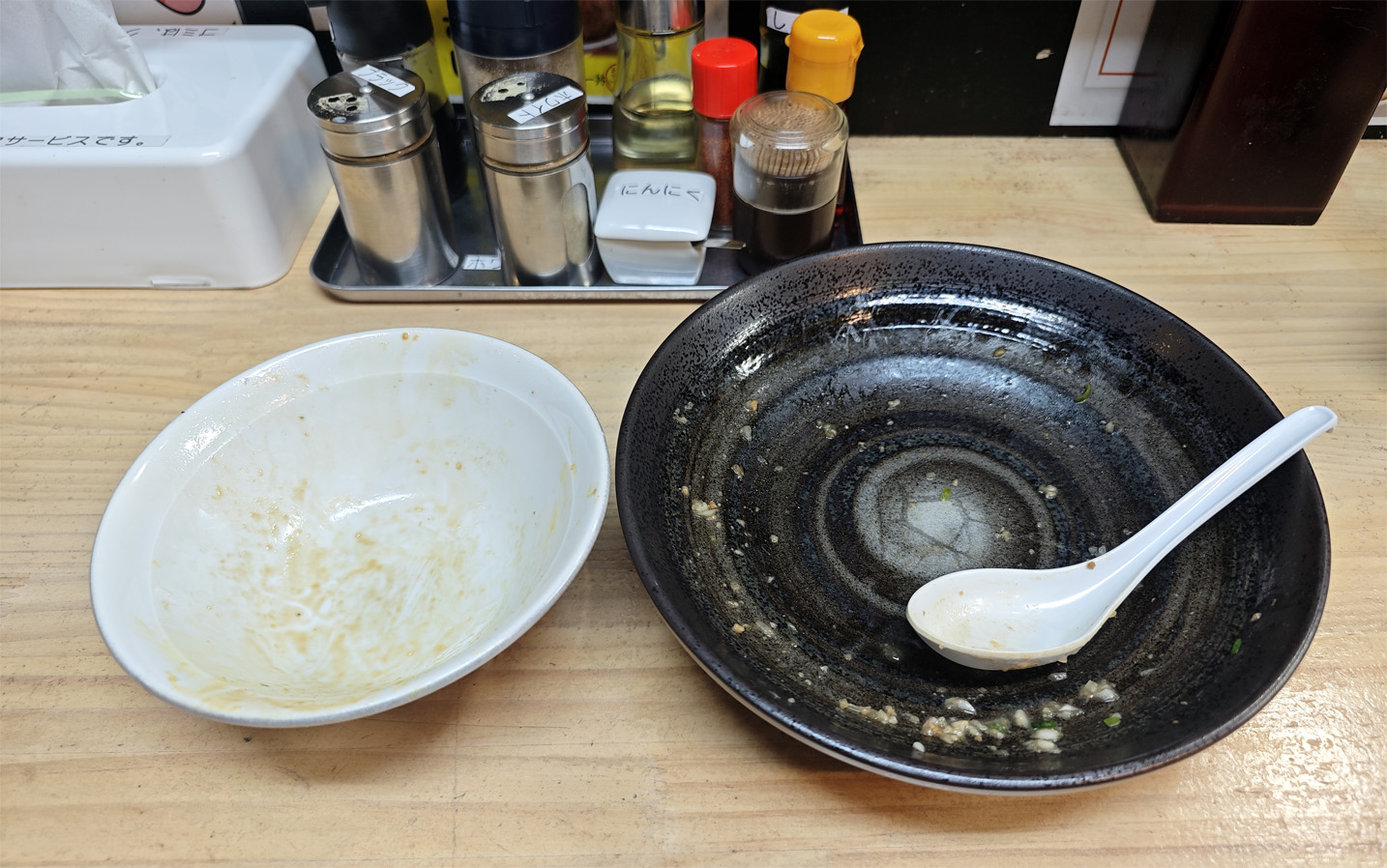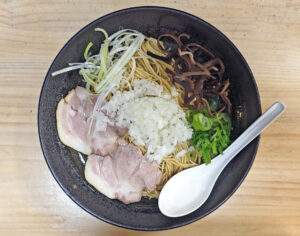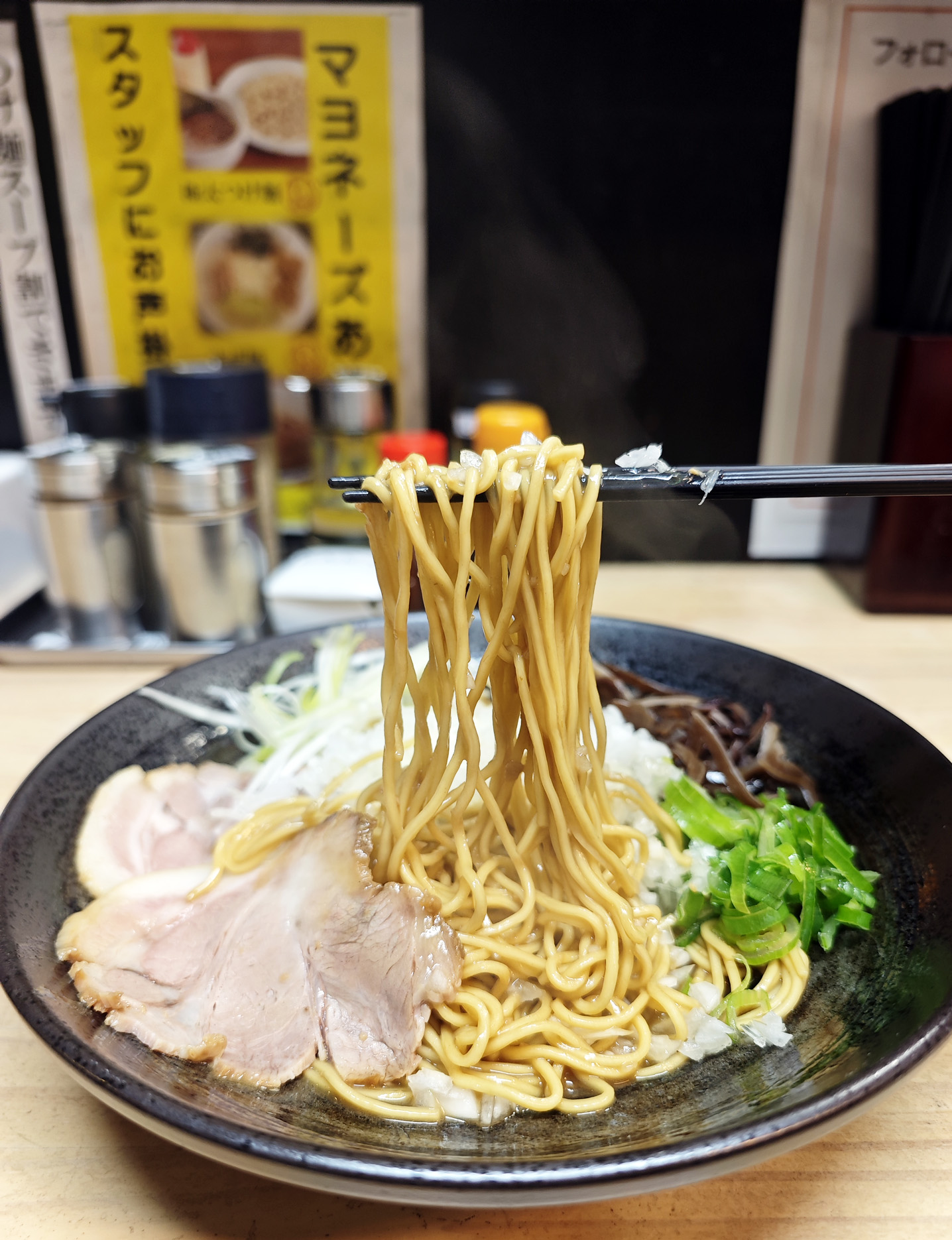 そのままだと薄味でしたので、卓上のラーメンタレをひと回し加えることで一気に輪郭が引き締まり、コクと旨味が際立つ絶妙なバランスに。