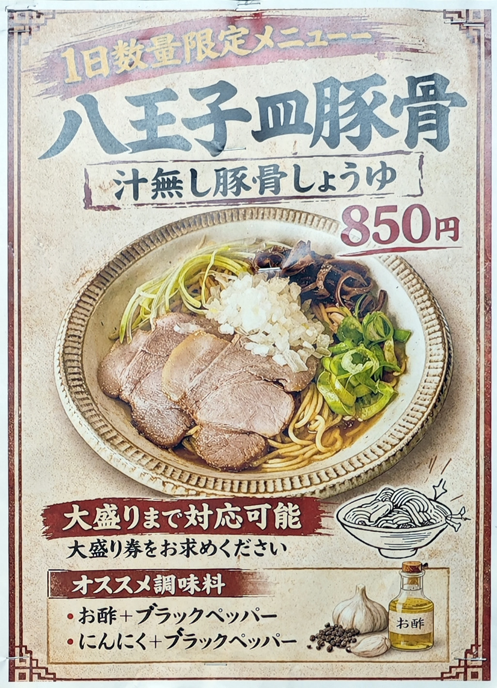 「八王子皿豚骨」は、八王子では今、まさに、その登場するタイミングが秀逸で、話題性と注目度を兼ね備えた、記憶に残る一皿と言えるでしょう。