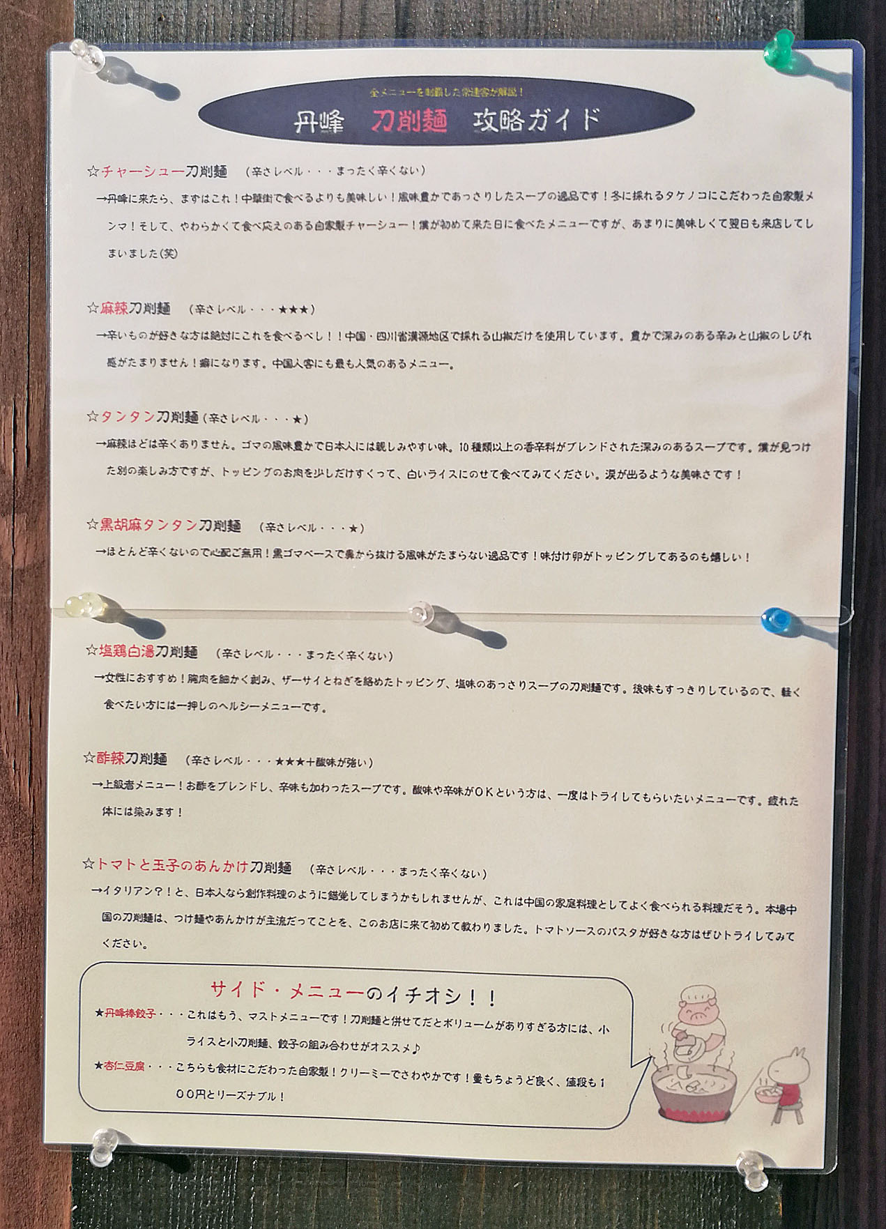さらにお店の壁面には「丹峰 刀削麺 攻略ガイド」なるものが貼ってありました。メニューの概要が説明されているので、とても参考になると思います。