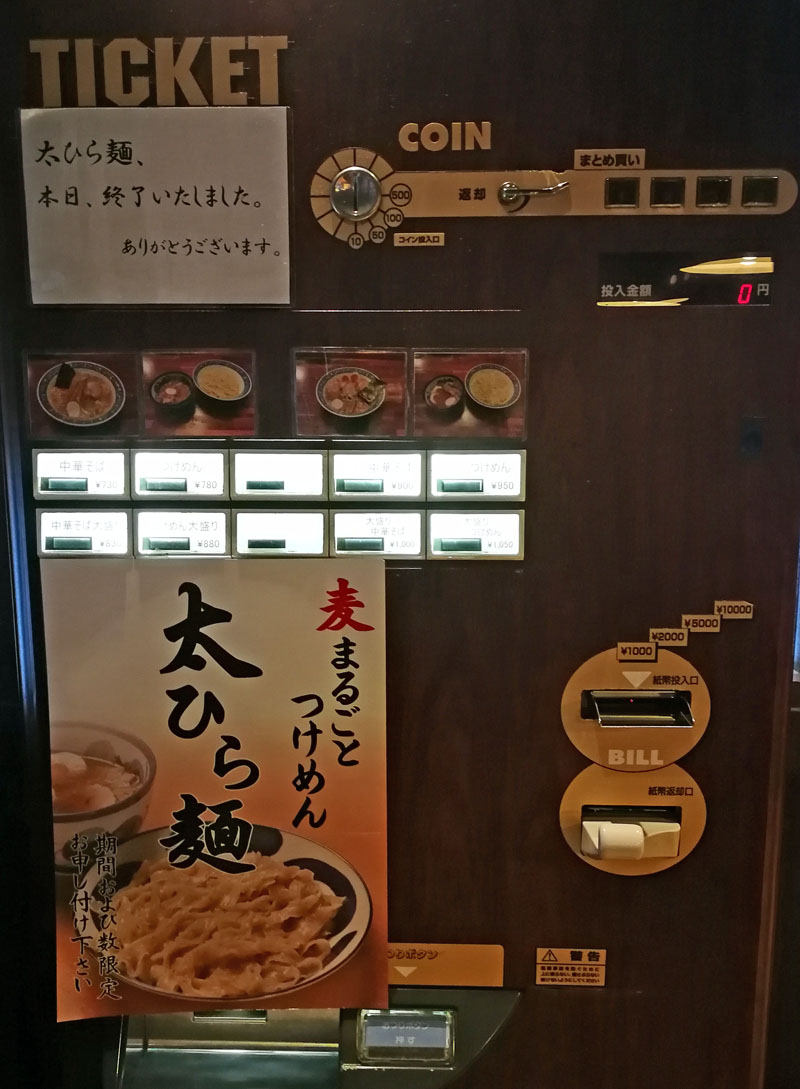 店内に入り券売機をみると限定で「麦まるごとつけめん 太ひら麺」の貼り紙がありましたが、残念ながら訪問時には既に終了していました。そんなわけで、今回はシンプルに「中華そば」730円を注文です。