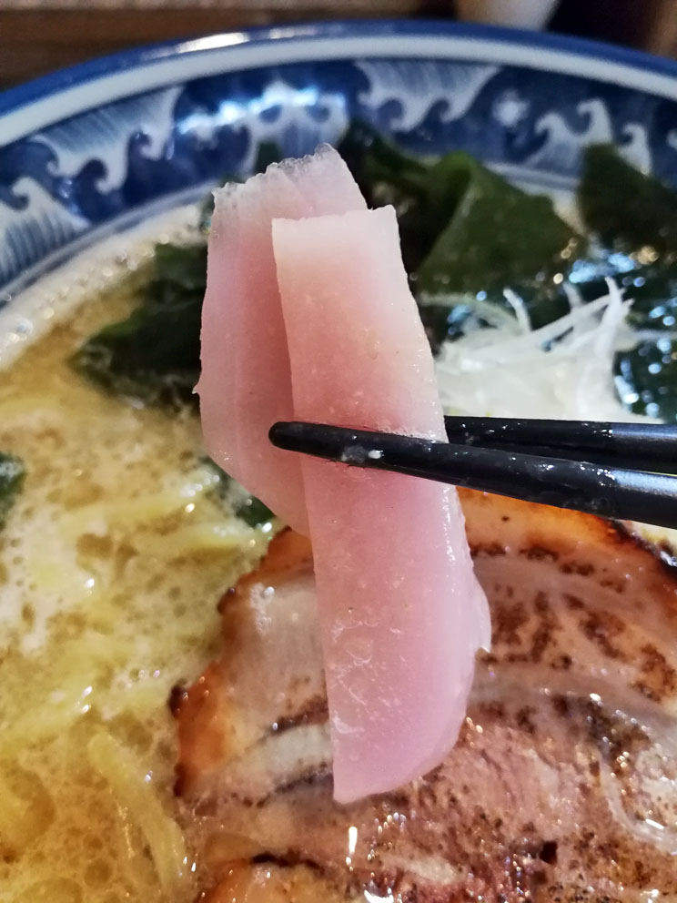 具は、チャーシュー、ワカメ、菜の花、生姜、ネギです。スープの中には少量のスライス玉ねぎ、挽肉も埋もれていました。ワカメが意外とドッサリと入っていました。