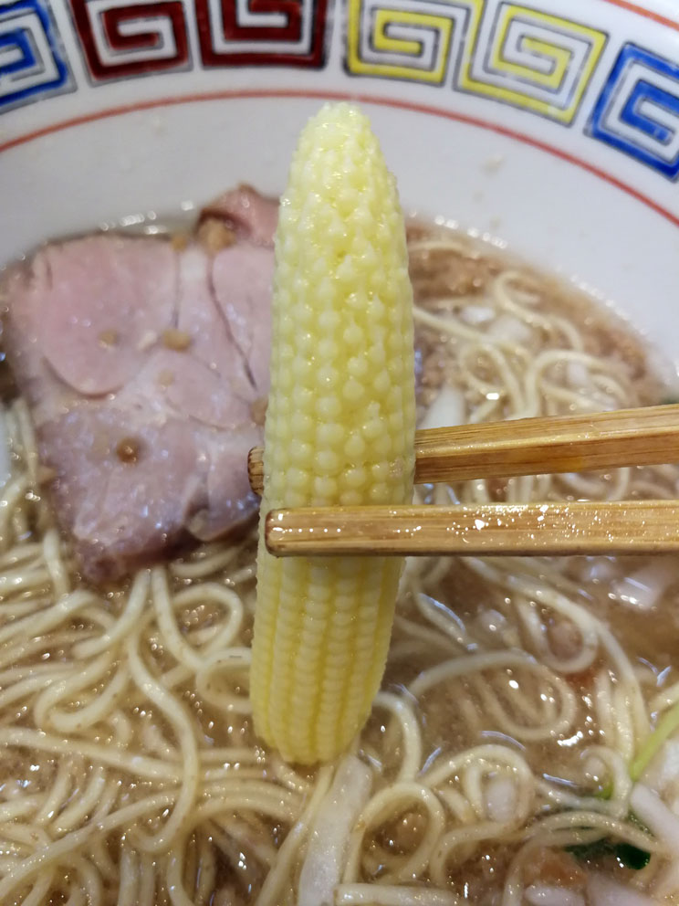 具は、チャーシュー2枚、味玉(半身)、ヤングコーン(半分)、刻み玉ネギ、カイワレです。