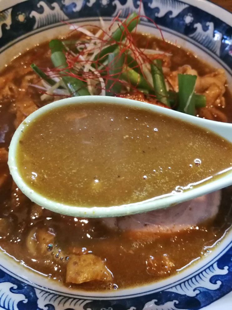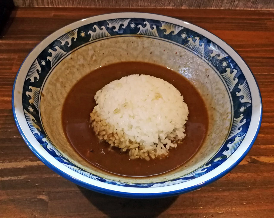 麺を具を食べ終わると濃厚なカレースープが残るので、別途用意していた半ライスをドボン!です。