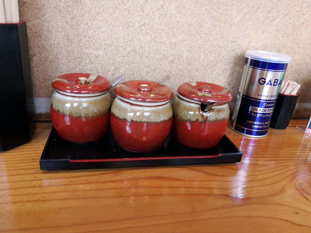 卓上調味料は、ブラックペッパー、おろしニンニク、豆板醤、高菜です。